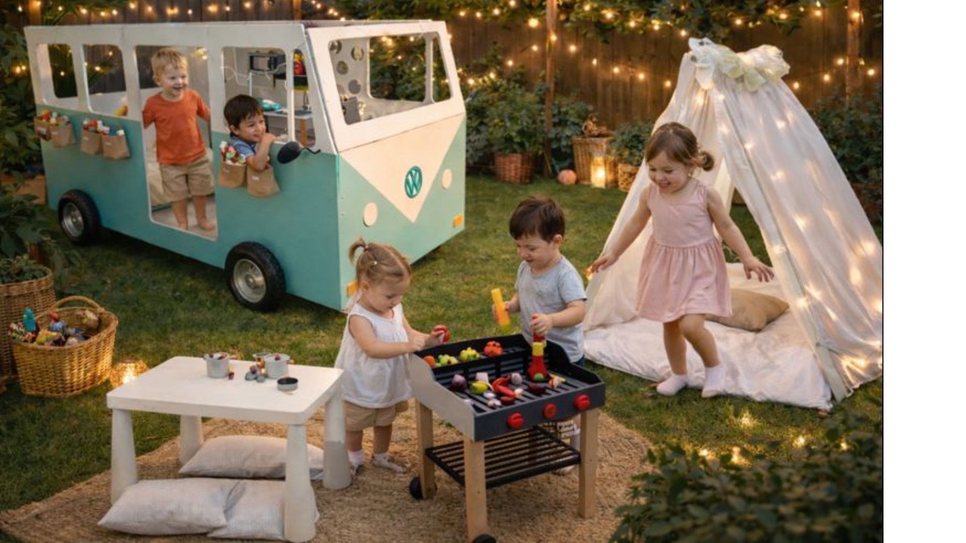 El Rincón recrea una zona de picnic con tipi, la Furgoneta T1 y fogata, donde los peques pueden imaginar escapadas, contar historias y jugar a vivir al aire libre.