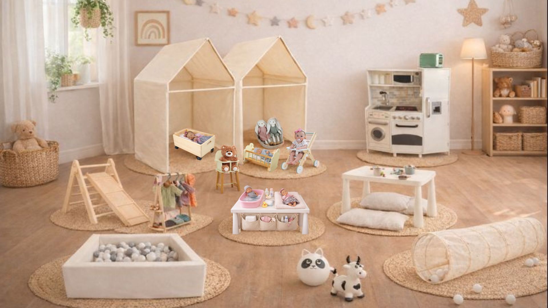 En este espacio encontrarás casitas, muñecos y peluches, un rinconcito para cuidar y cambiarlos, con ropita y accesorios para jugar e imaginar historias y dar muchos mimos.